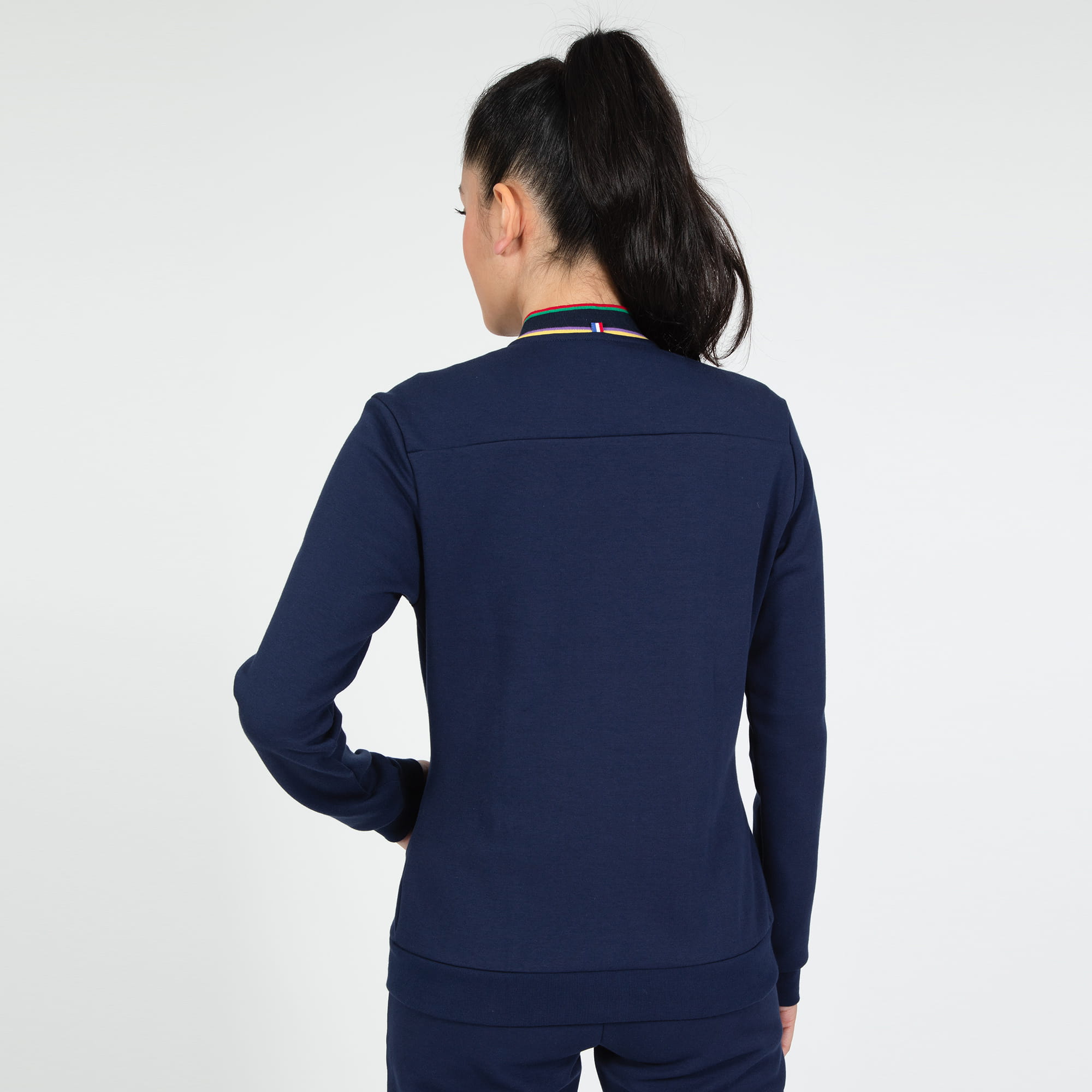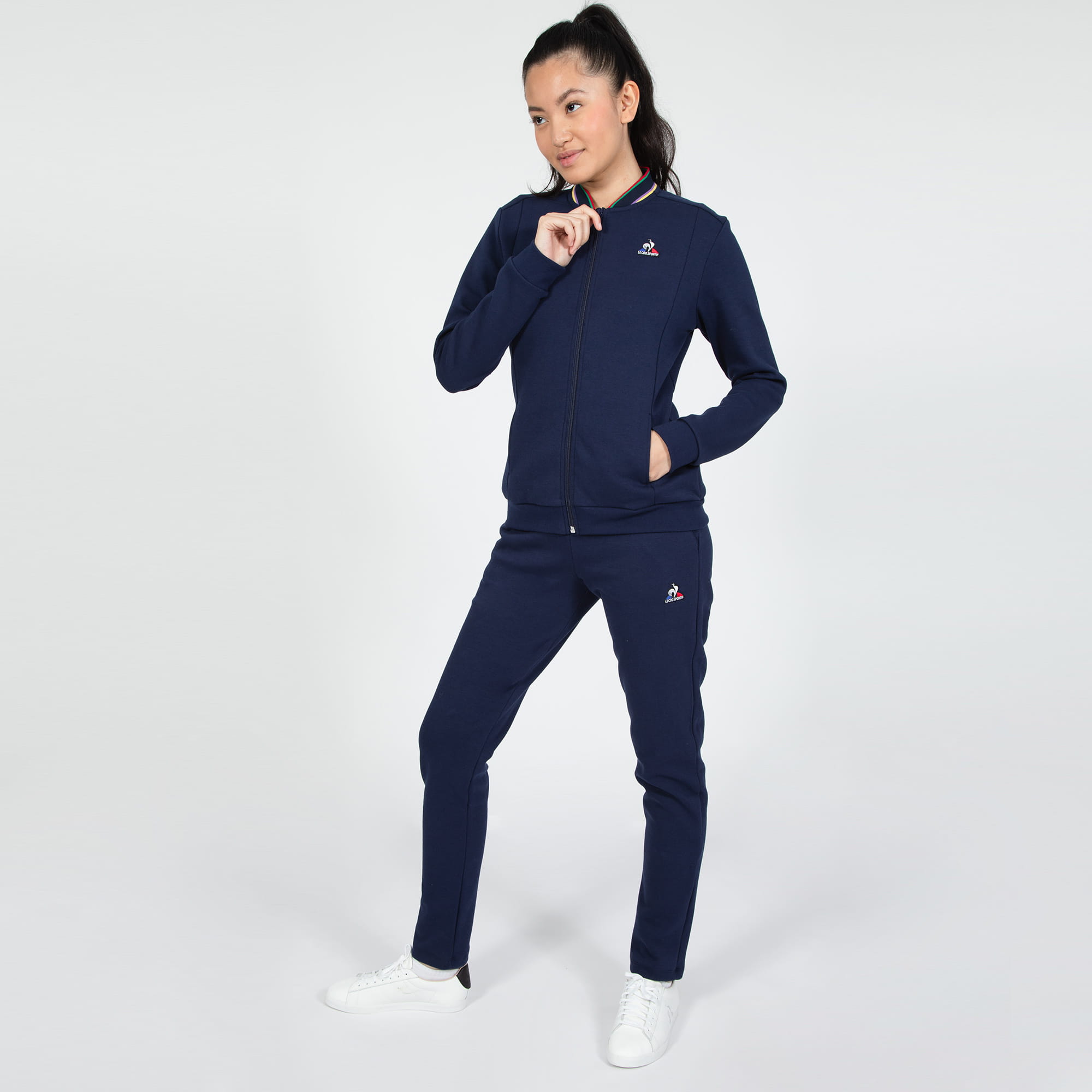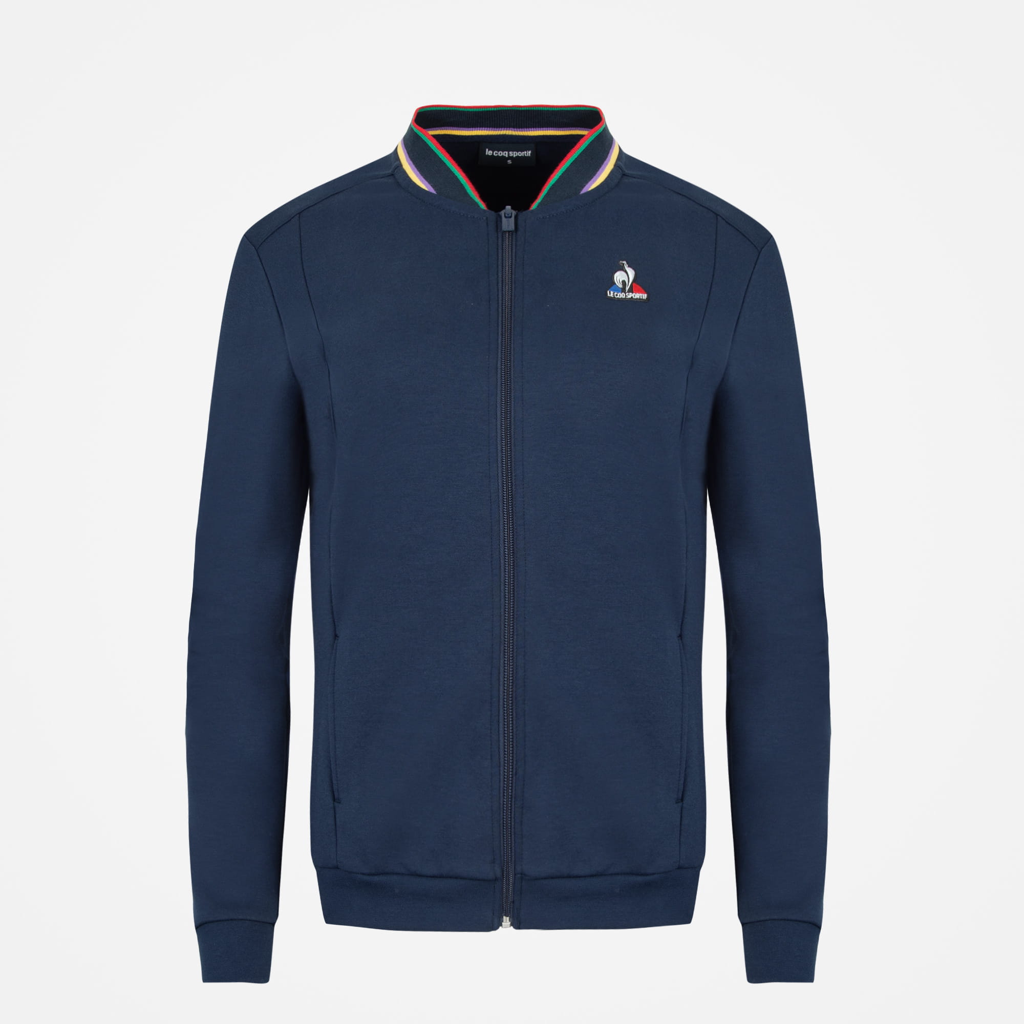 Damska bluza zapinana na suwak wykonana z dwustronnej bawełny 300g. Regularny, klasyczny krój typu bomber. Po bokach dwie kiszenie, kołnierz wykonany z trójkolorowego ściągacza, co dodaje bluzie wyjątkowości. Na lewej piersi haftowane logo marki Le Coq Sportif.